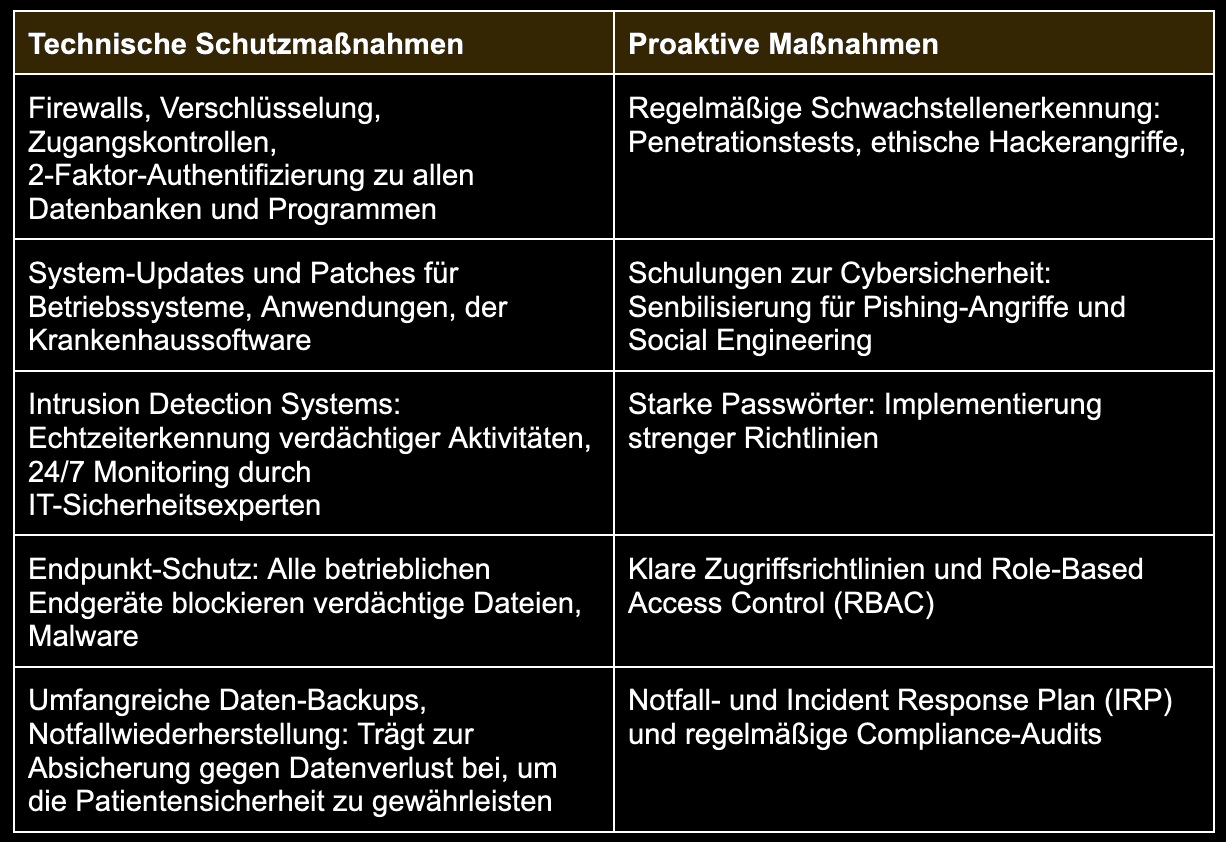 Um Hackerangriffen und Datenverlusten vorzubeugen, müssen Krankenhäuser umfassende technische und proaktive Sicherheitsmaßnahmen implementieren. Diese Maßnahmen sorgen nicht nur für den Schutz von Systemen und Daten, sondern auch für eine schnelle Reaktion im Fall eines Vorfalls.