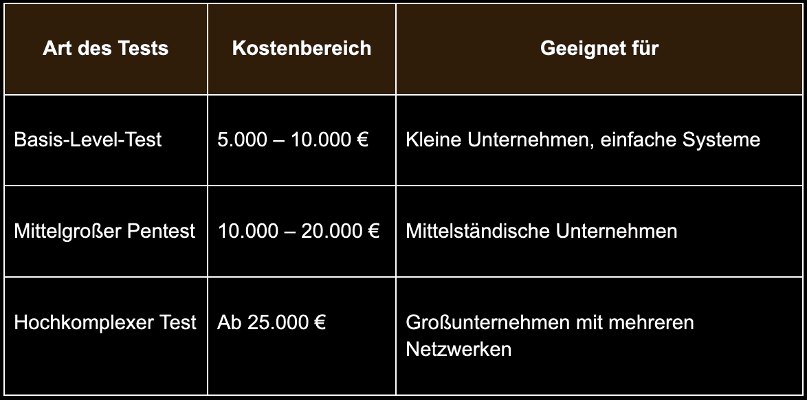 Die durchschnittlichen Kosten für einen Penetrationstest liegen zwischen 6.000 und 35.000 Euro. Kleinere Tests starten bei etwa 5.000 Euro, während komplexe Projekte mit erweiterten Anforderungen auch 100.000 Euro übersteigen können.