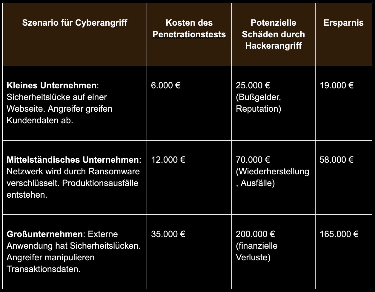 Betriebe sollten ihr Budget für Penetrationstests sorgfältig planen. Dennoch ist es ratsam, nicht nur auf die günstigste Lösung zu setzen. Ein gründlich durchgeführter Pentest stellt eine Investition dar, die im Vergleich zu den potenziellen Kosten eines Hackerangriffs deutlich geringer ausfällt. Die folgende Gegenüberstellung zeigt, wie Penetrationstests langfristig Schäden verhindern können.